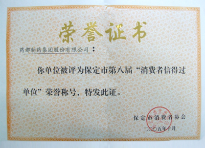2006年3月15日,河北省消費(fèi)協(xié)會(huì)為我公司頒發(fā)河北省第八屆“消費(fèi)者信得過(guò)單位”證書。