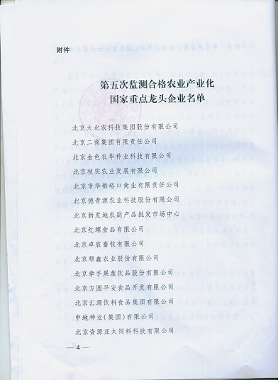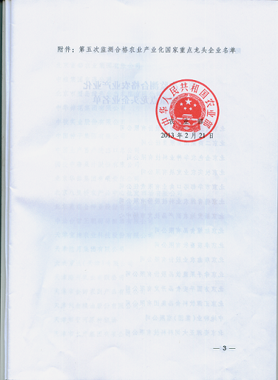 2013年2月,經(jīng)全國農(nóng)業(yè)產(chǎn)業(yè)化聯(lián)席會議審定,農(nóng)業(yè)產(chǎn)業(yè)化國家重點龍頭企業(yè)第五次監(jiān)測我公司被認定為合格。