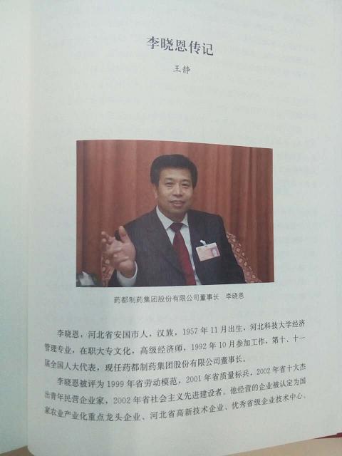 由保定市企業(yè)家協(xié)會編纂,保定市市長馬譽峰、保定市企業(yè)家協(xié)會會長、政協(xié)保定市第十屆主席王慶明作序的《創(chuàng)業(yè)史-保定企業(yè)》叢書第一集已由吉林大學出版社正式出版發(fā)行。該書旨在為企業(yè)歌功頌德,為企業(yè)家樹碑立傳,藥都制藥集團董事長李曉恩先生的個人傳記被收錄其中。