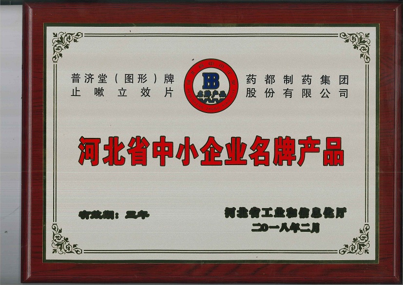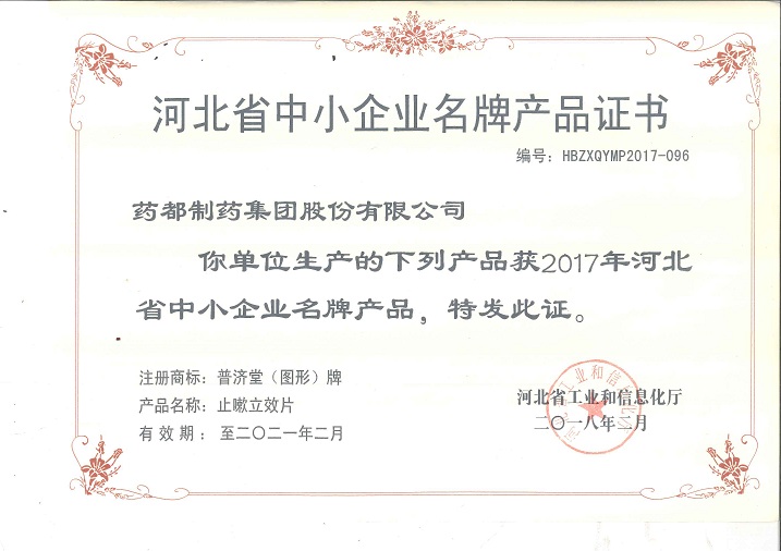 普濟堂牌止嗽立效片榮獲2017年河北省中小企業(yè)名牌產(chǎn)品
